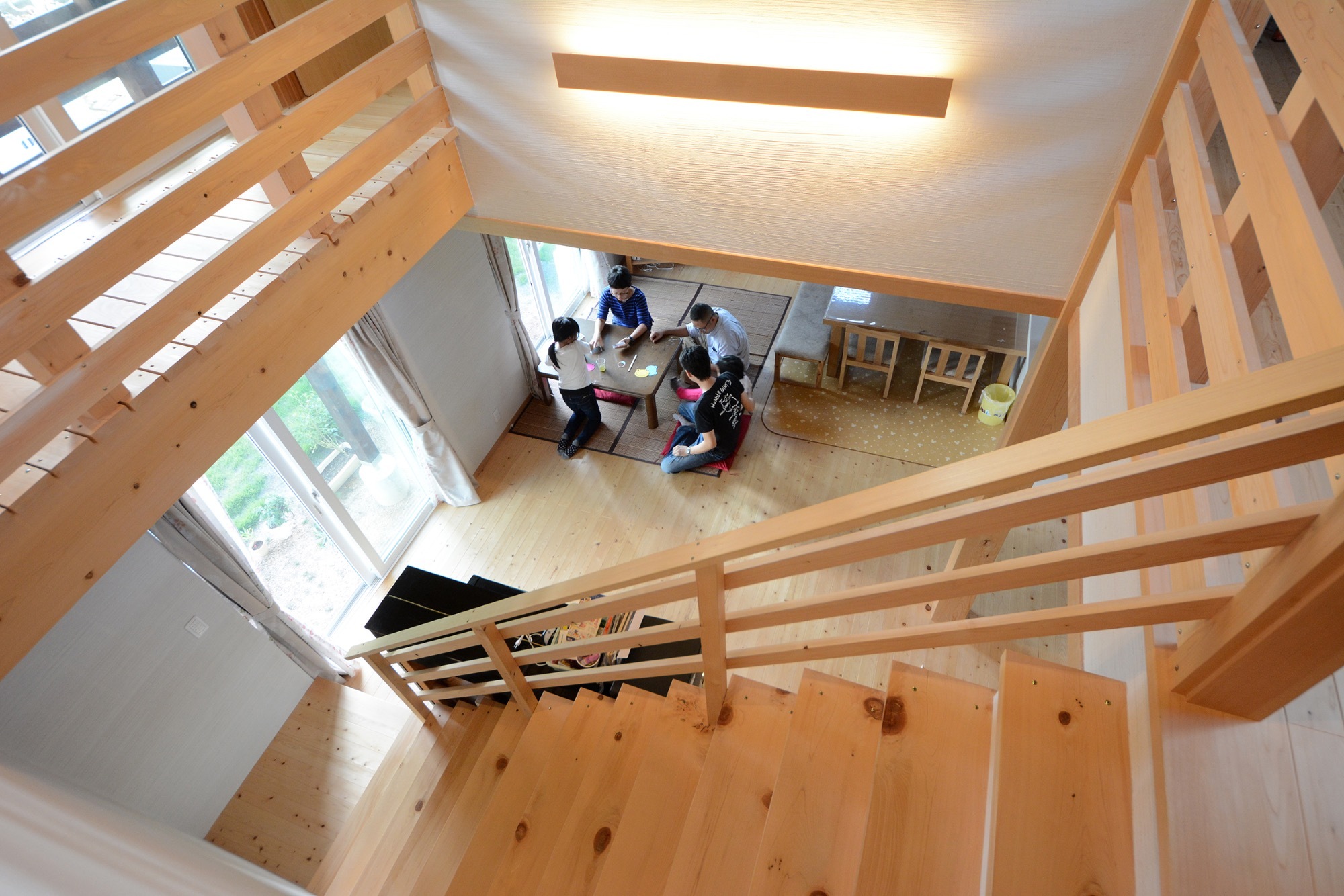 吹き抜のリビングからのびる階段は、2階の回廊につながり、どの部屋からも扉を開けるとリビングが見下ろせます。 家族がばらばらにならない、あたたかいお家。